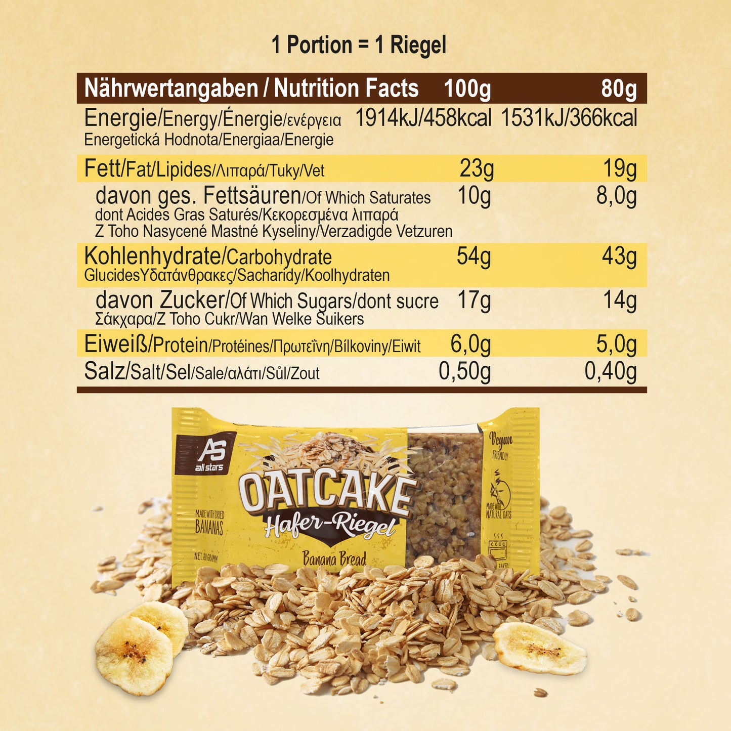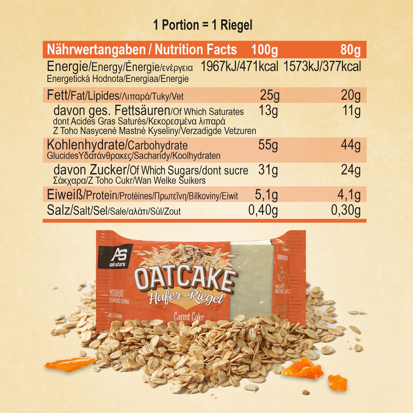 ALL STARS OATCAKE Tyčinky jsou měkké ovesné tyčinky pro aktivní dny. Hodí se jako svačina během dne, před nebo po cvičení, stejně jako jako sacharidy bohaté jídlo na cestách. Ideální, když je málo času na plnohodnotné jídlo.
