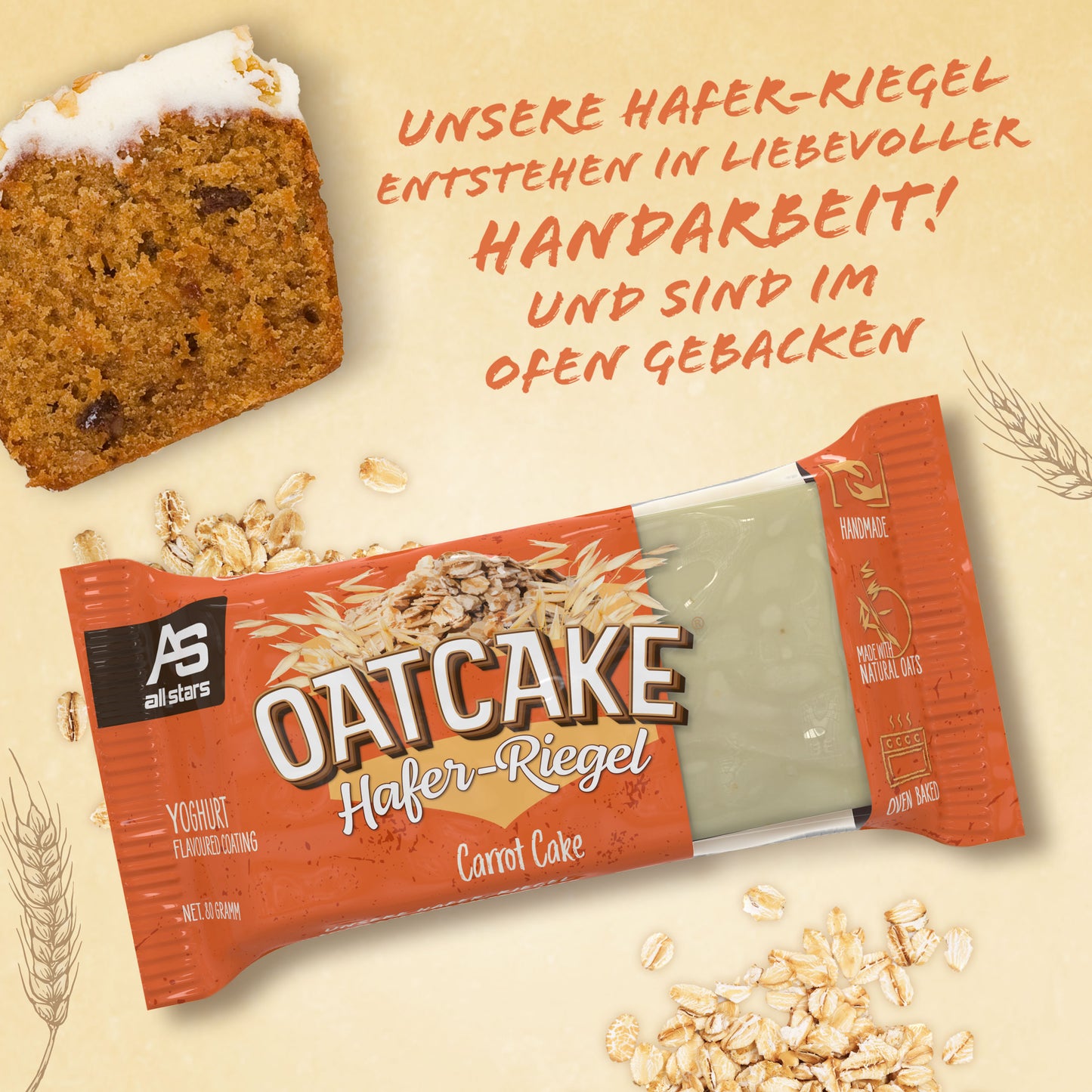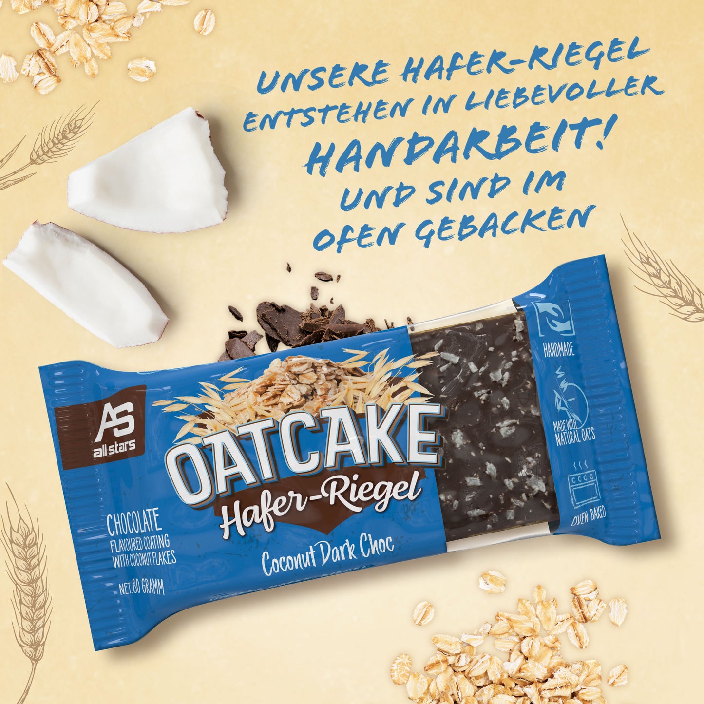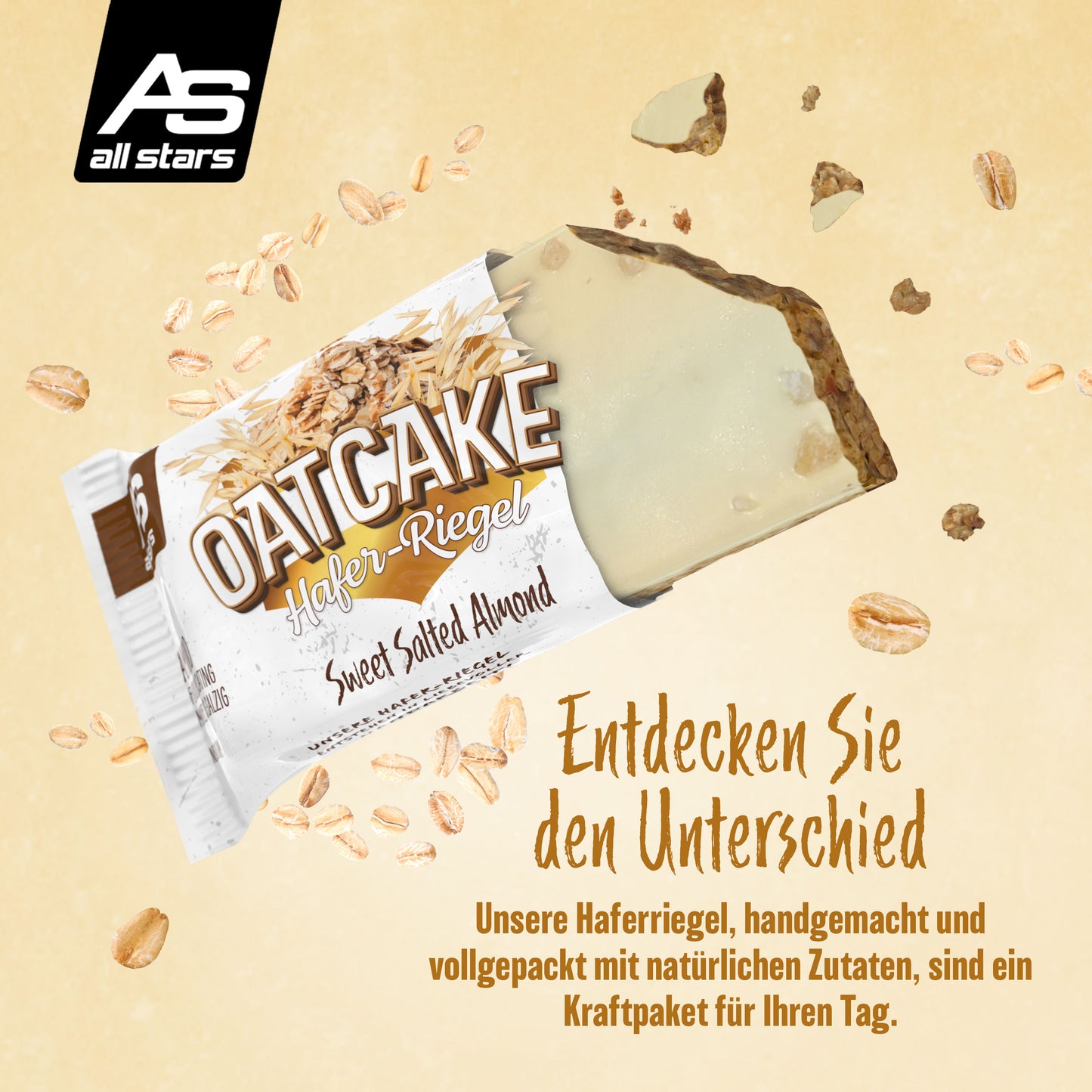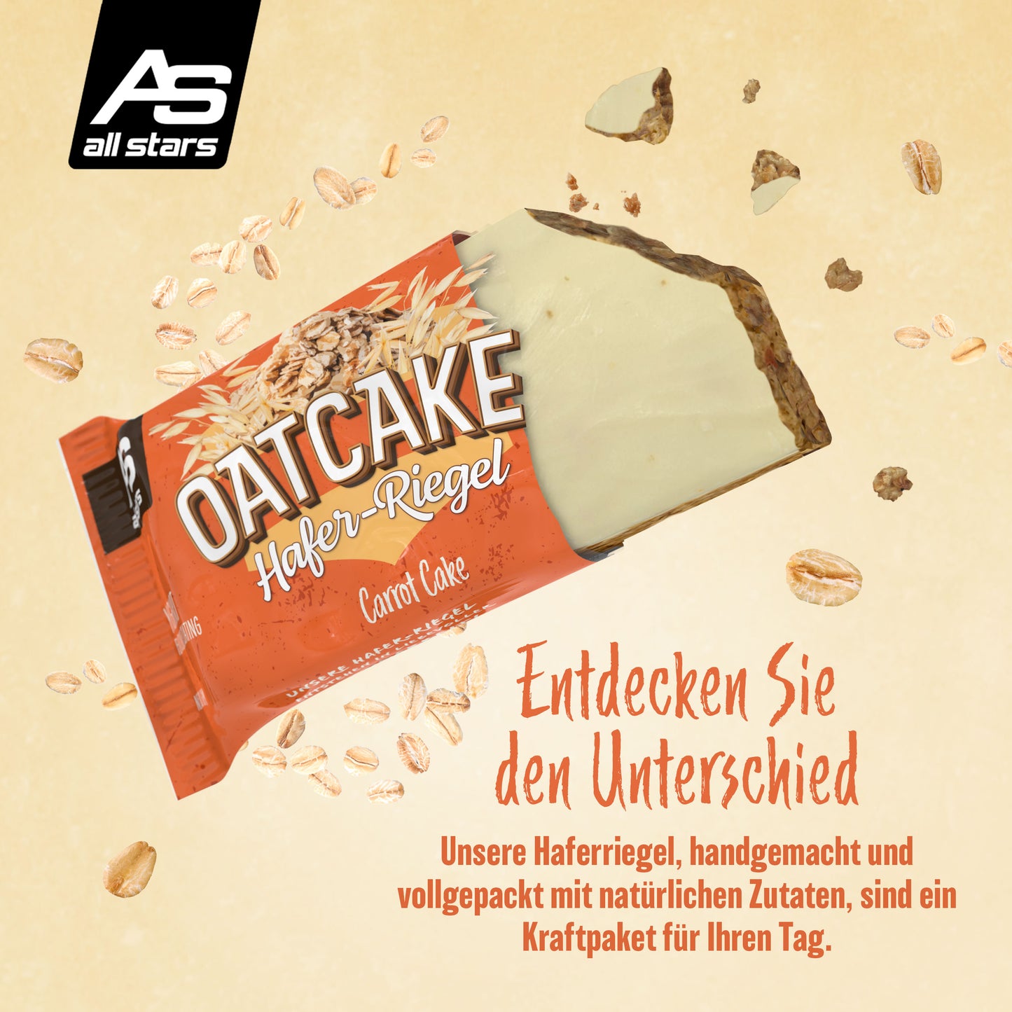 Nová 80g ovesná tyčinka od ALL STARS je ideální náhradou jídla před tréninkem nebo na cestách, když není čas na pořádné jídlo. OATCAKE tyčinka je vyrobena s láskou ručně a pečena v troubě.