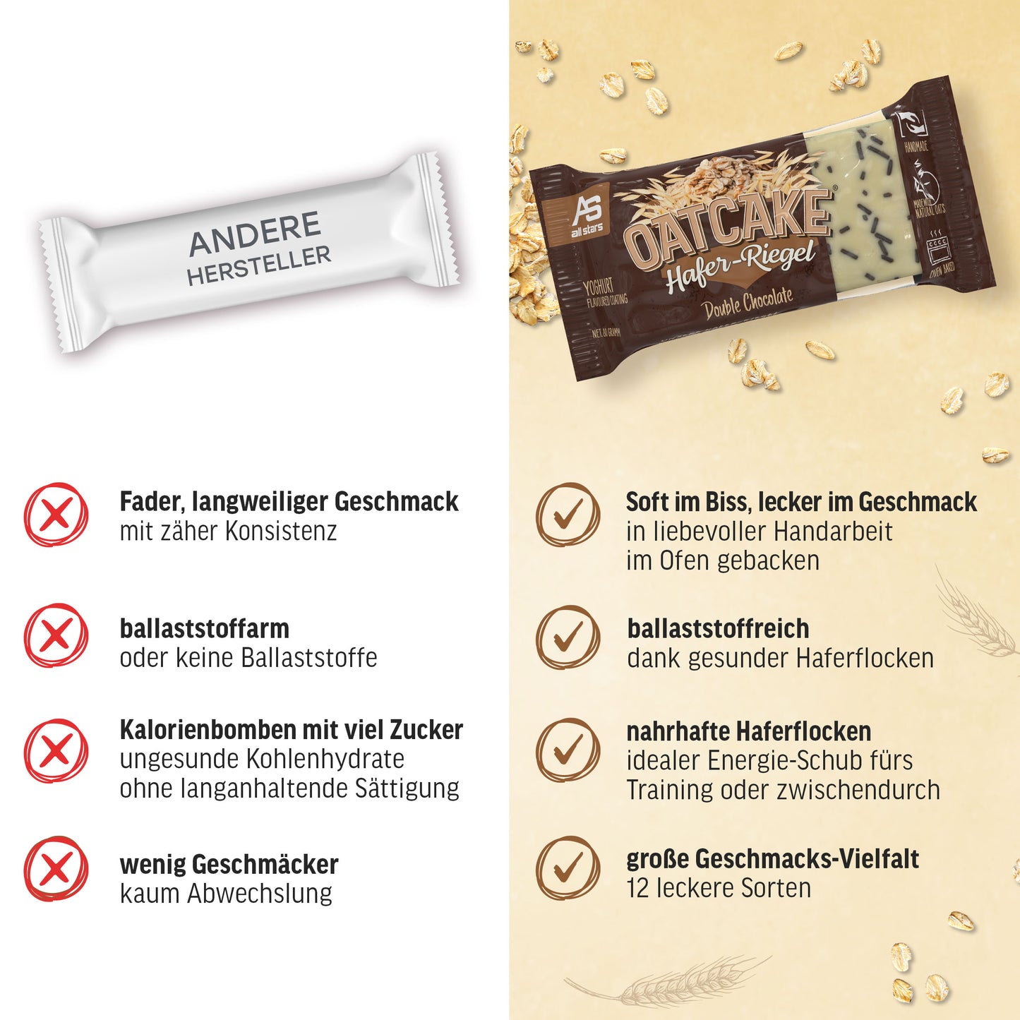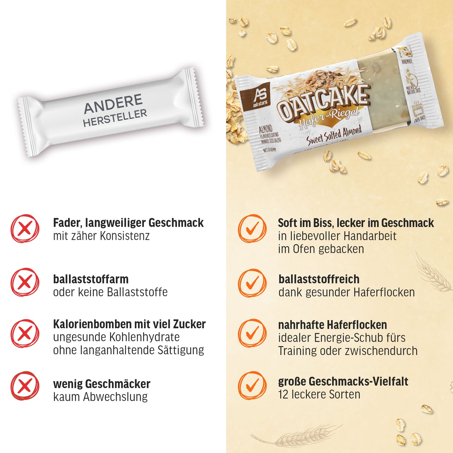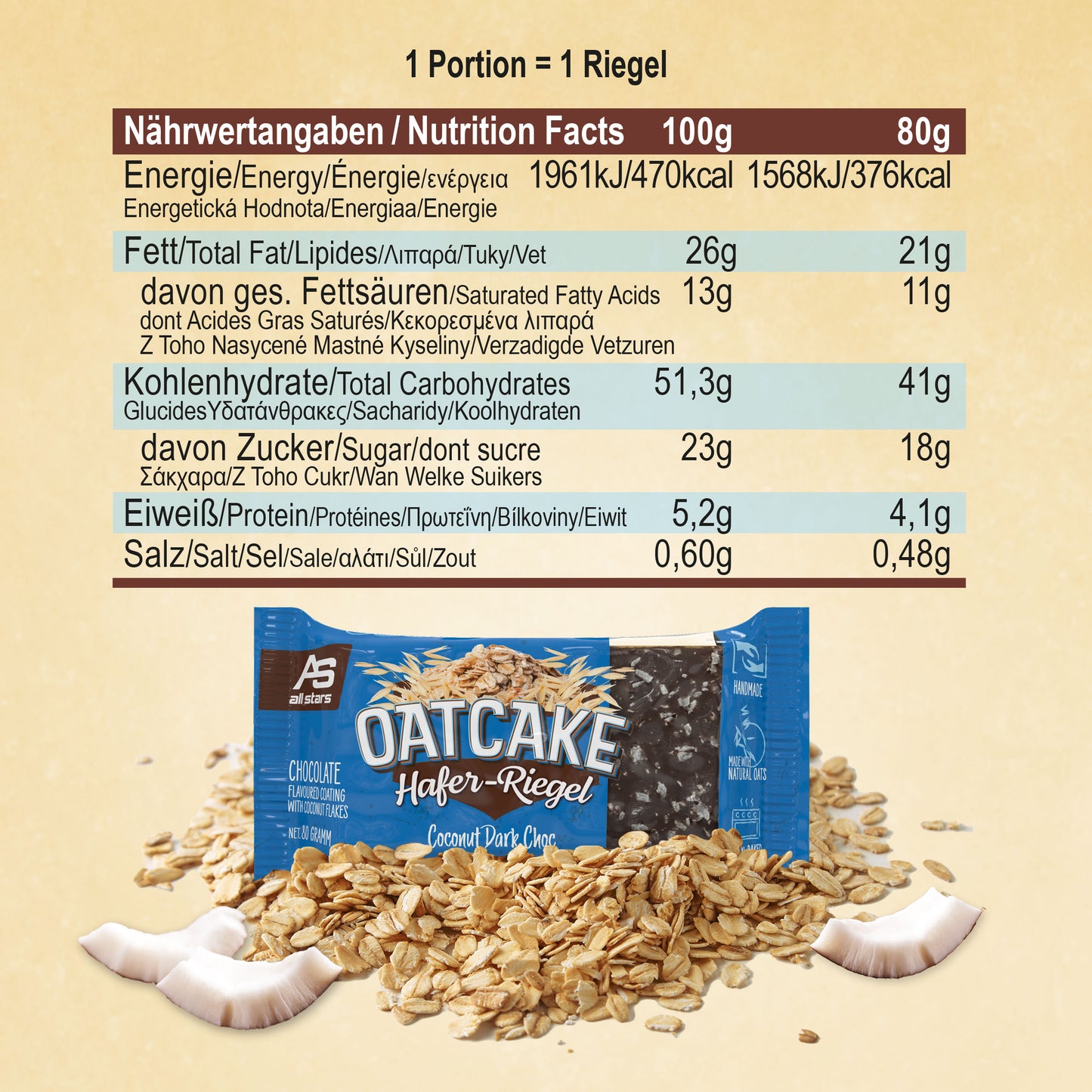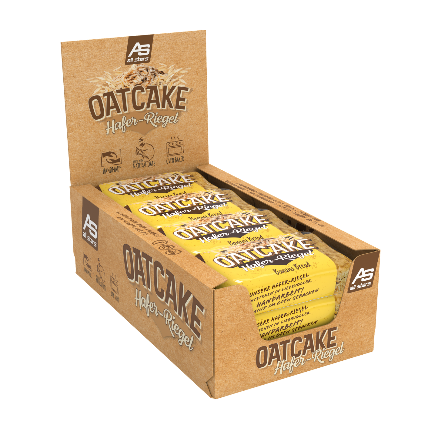 Nová 80g ovesná tyčinka od ALL STARS je ideální náhradou jídla před tréninkem nebo na cestách, když není čas na pořádné jídlo. OATCAKE tyčinka je vyrobena s láskou ručně a pečena v troubě.