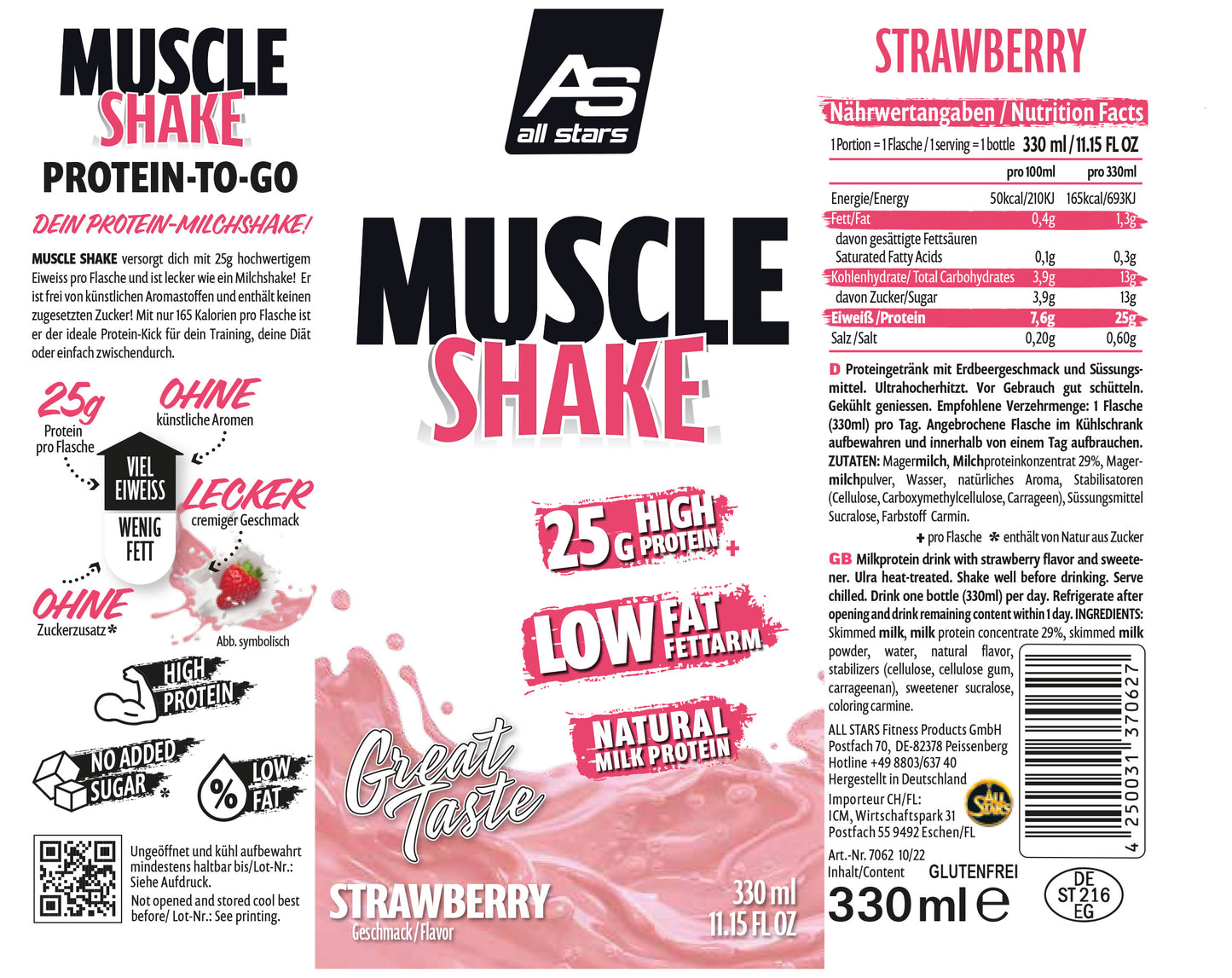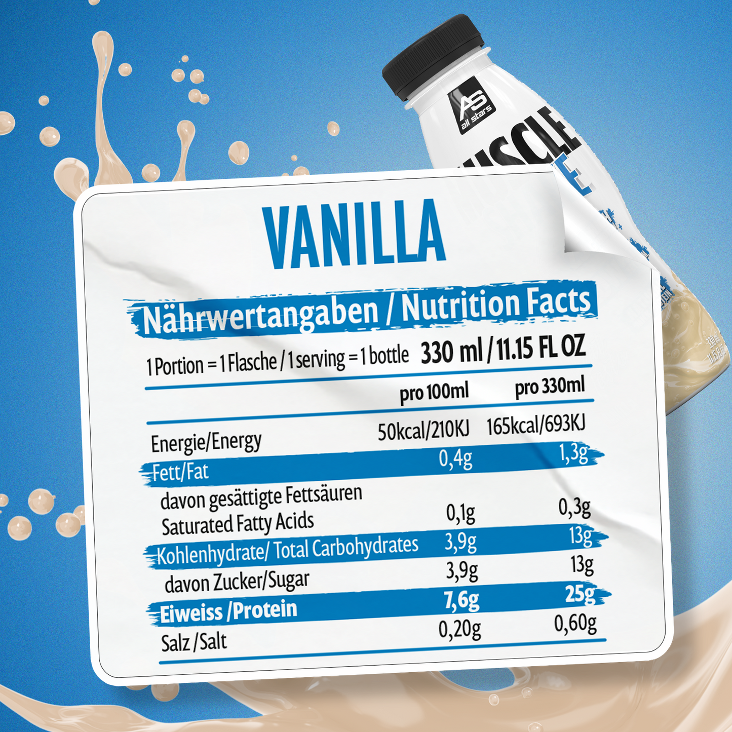 Muscle Shake 330ml od ALL STARS – ve třech lahodných příchutích – Jahoda, Vanilka a Čokoláda. Ideální pro sportovce různých sportovních disciplín. Láhev jen krátce protřepat a Muscle Shake nejlépe vychladit před konzumací.