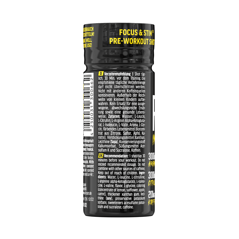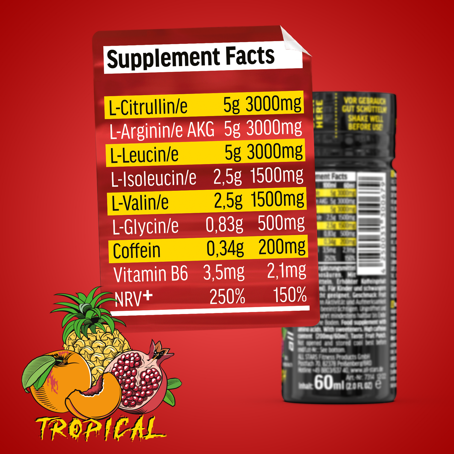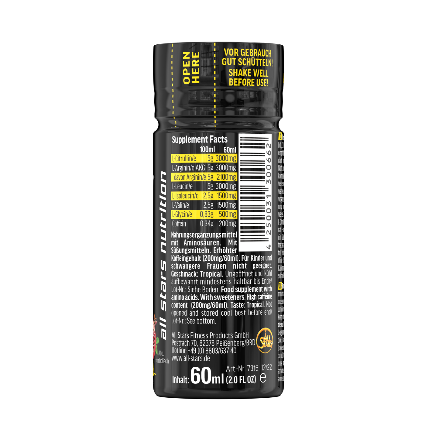 60 ml v lahodné, ovocné chuti, obsahující 8,7 g bílkovin, které jsou rozloženy na nejmenší stavební kameny bílkovin a obohaceny o kofein. Připravený k přímé konzumaci je tento shot perfektním nakopnutím před tréninkem. Dodává svalům důležité BCAA, aminokyseliny rozhodující pro dobrou produkci NO a kvalitní dávku 200 mg kofeinu.