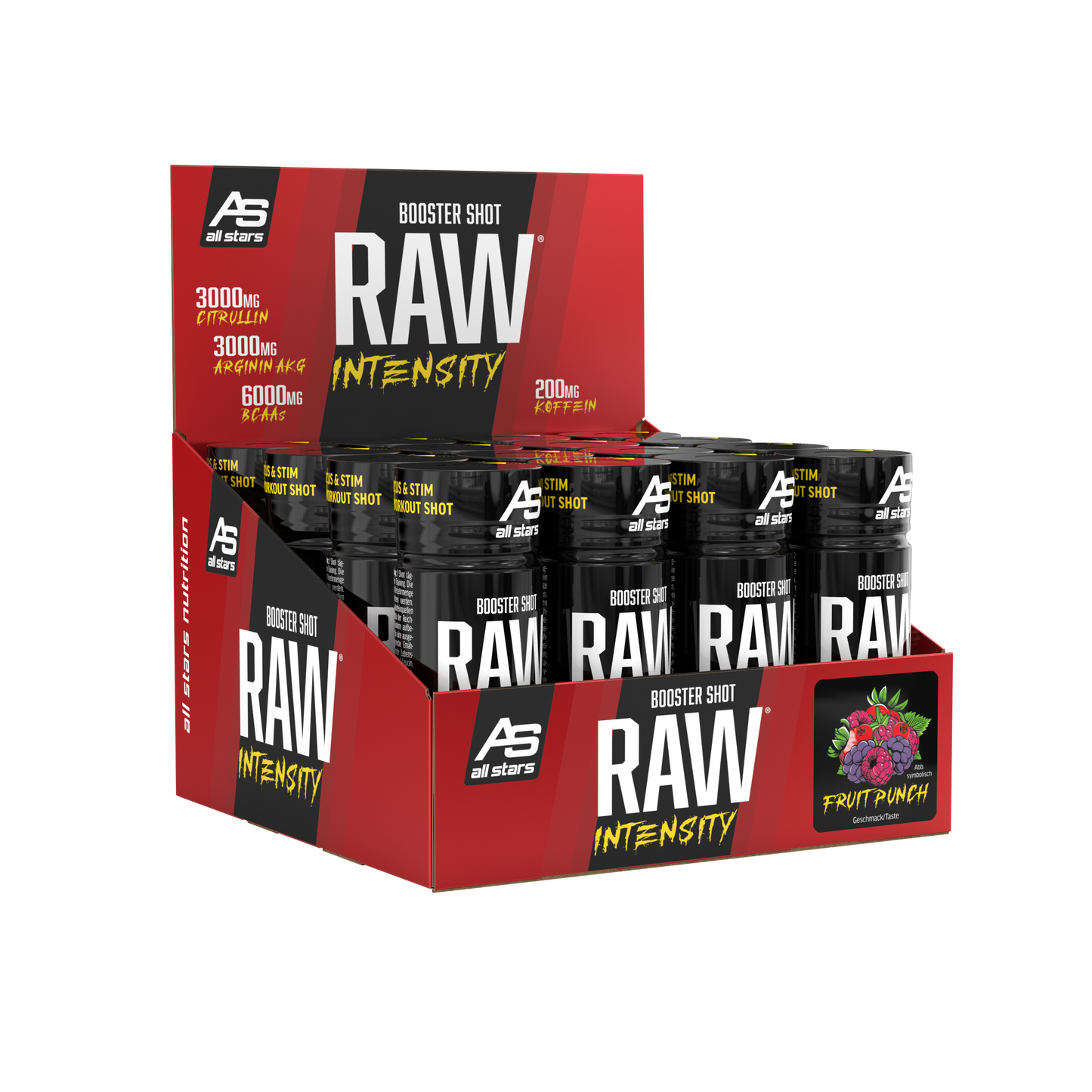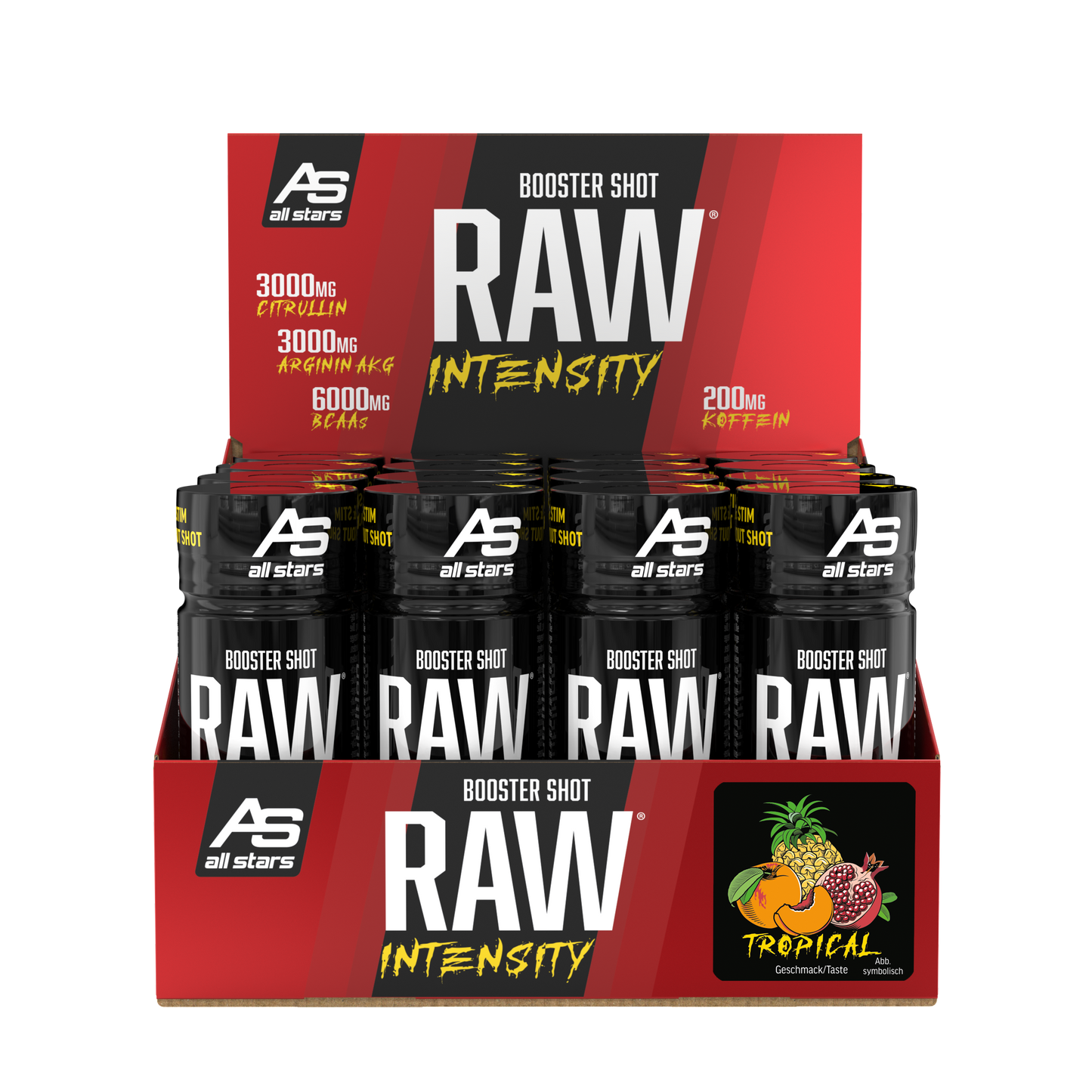 V závislosti na čase tréninku není vždy dostatek času na vyvážené a výživné jídlo, které by navíc tělo zbytečně nezatěžovalo. Shot, který se skládá převážně z BCAA Leucin, Isoleucin a Valin v osvědčeném poměru 2:1:1 (3 g k 1,5 g), Argininu jako alfa-ketoglutarátu (3 g), Citrulinu (3 g), Glycinu (0,5 g) a kofeinu, je připravený k přímé konzumaci a předodměřený. Slazený je sladidlem, každá 60ml porce obsahuje něco málo přes 52 kcal. Ideální na cesty, k použití před tréninkem po dlouhém pracovním dni nebo před ranním tréninkem. Užívání by mělo proběhnout 30 minut před začátkem. Raw Intensity Shot nekombinujte s jinými nápoji obsahujícími kofein.