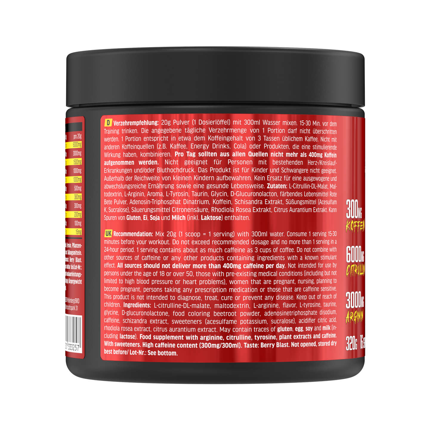 Booster obsahuje vše, co by měl dobrý pre workout doplněk obsahovat. Kromě aminokyselin L-citrulin a L-arginin obsahuje také N-acetyl-L-tyrosin, L-glycin, L-theanin a L-norvalin, dále taurín, kofein, Cordyceps Sinensis, extrakty ze schizandry, ginkgo biloby, černého pepře (Piper Nigrum) a hořkého pomeranče plus naringin. Prášek je oslazen sladidlem a hotový nápoj chutná po lahodných ostružinách. Každá plechovka obsahuje 20 porcí.