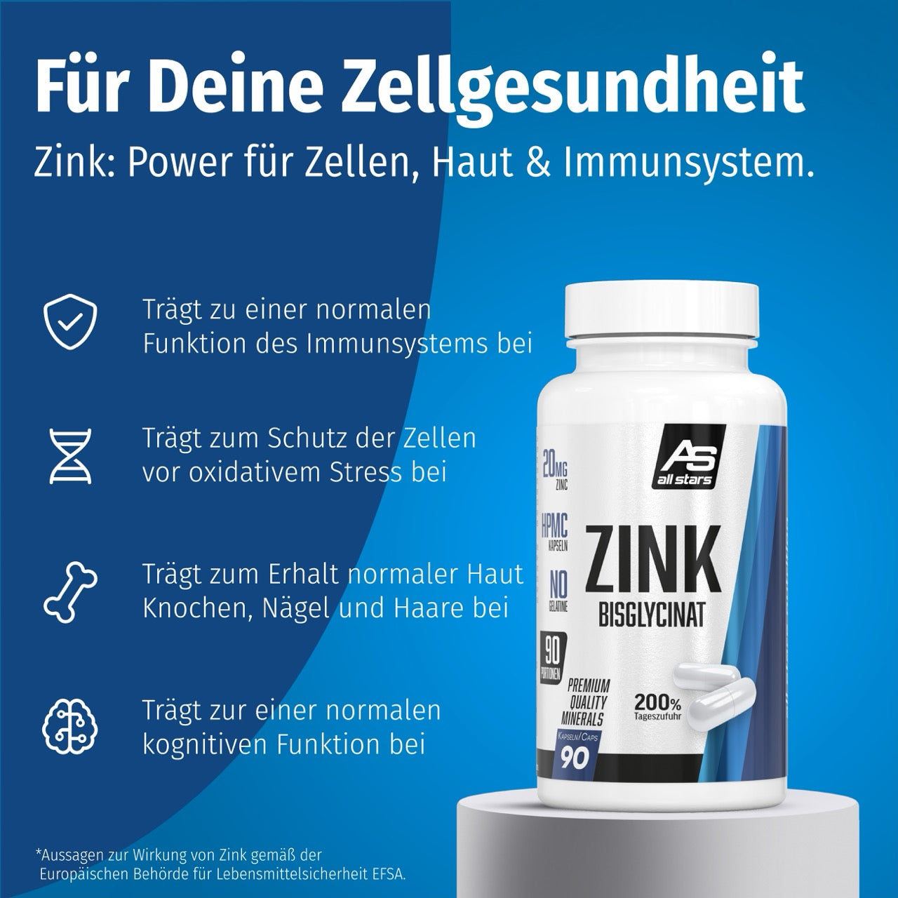 Zinek se podílí na metabolismu cukrů, tuků a bílkovin, a tím hraje důležitou roli při zásobování svalů energií a při budování nové svalové hmoty. Spolu s dalšími látkami se přímo podílí na růstu buněk. To a posílení imunitního systému je zvláště prospěšné sportovcům v intenzivních a náročných tréninkových fázích, kteří pracují na své svalové hmotě a chtějí ji co nejvíce zvýšit.Proč Pure Zink Kapsle od ALL STARS