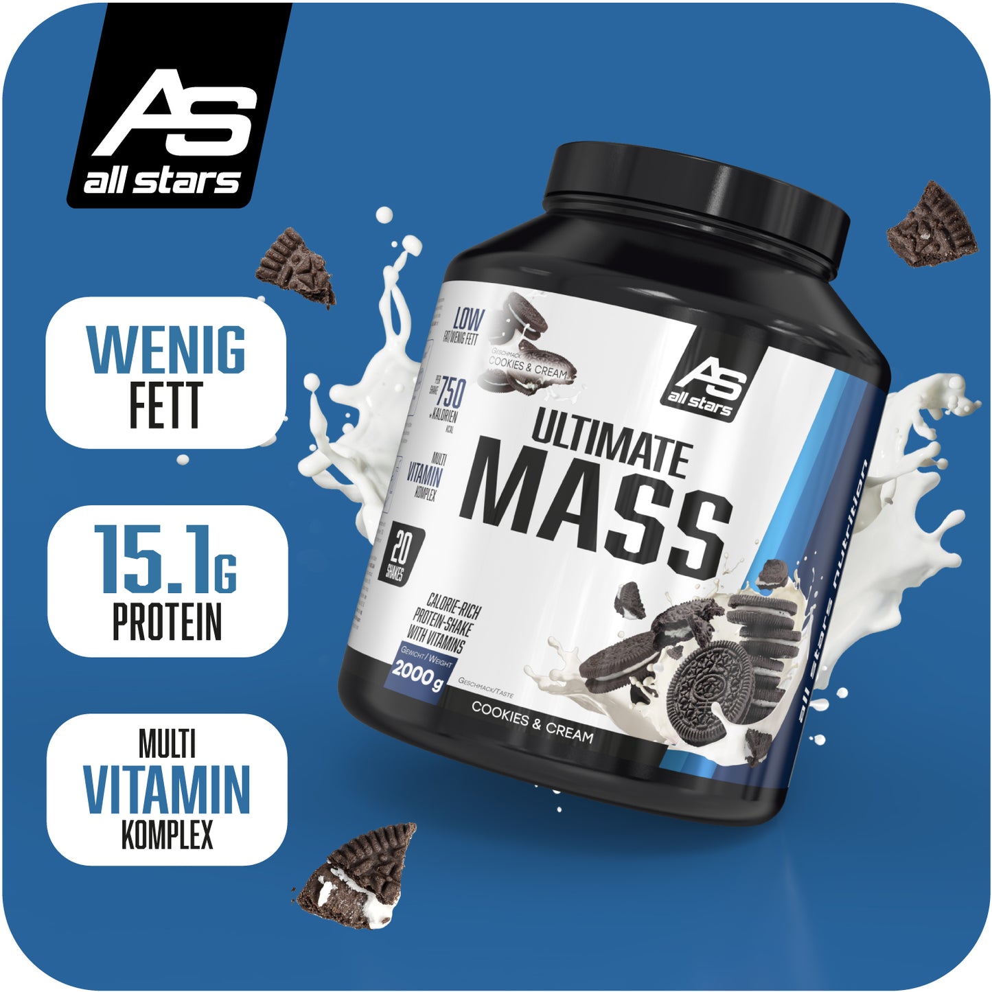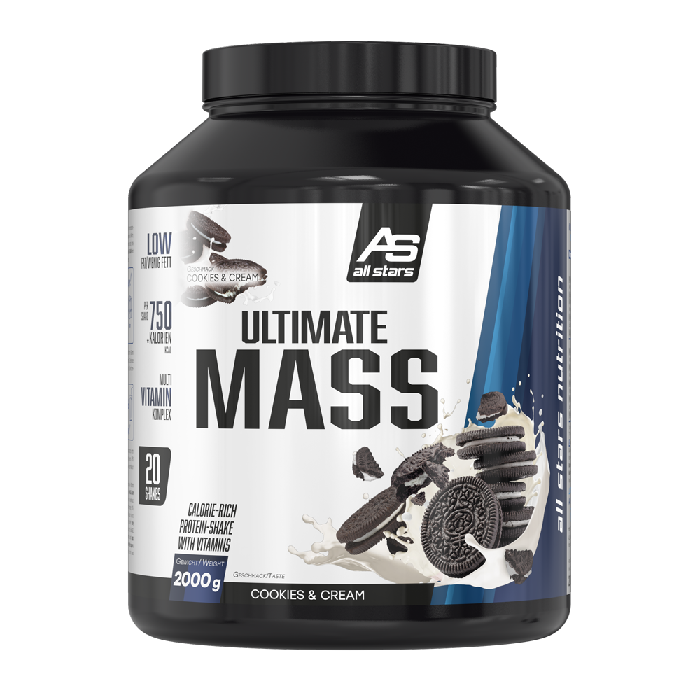Ultimate Mass je weight gainer pro fázi nárůstu hmoty, který dodává dostatek kalorií a je dostupný ve 3 lahodných příchutích (čokoláda, vanilka, cookies cream). V těchto fázích se díky přísunu více kalorií než je denní potřeba buduje hmota, která může být cíleným tréninkem přeměněna na svalovou hmotu. Dlouhodobým cílem tedy není jen samotný nárůst hmoty, ale větší a silnější svaly.