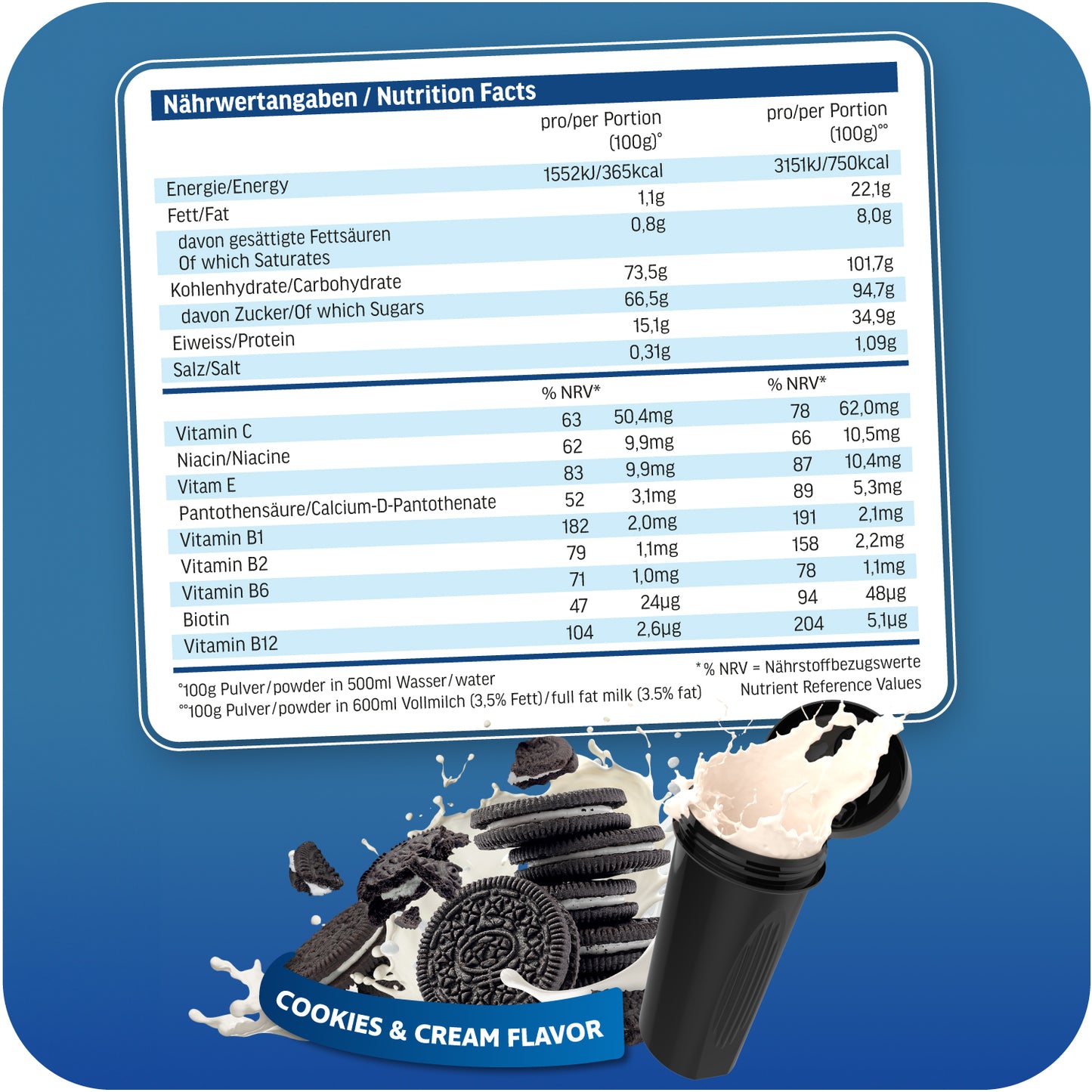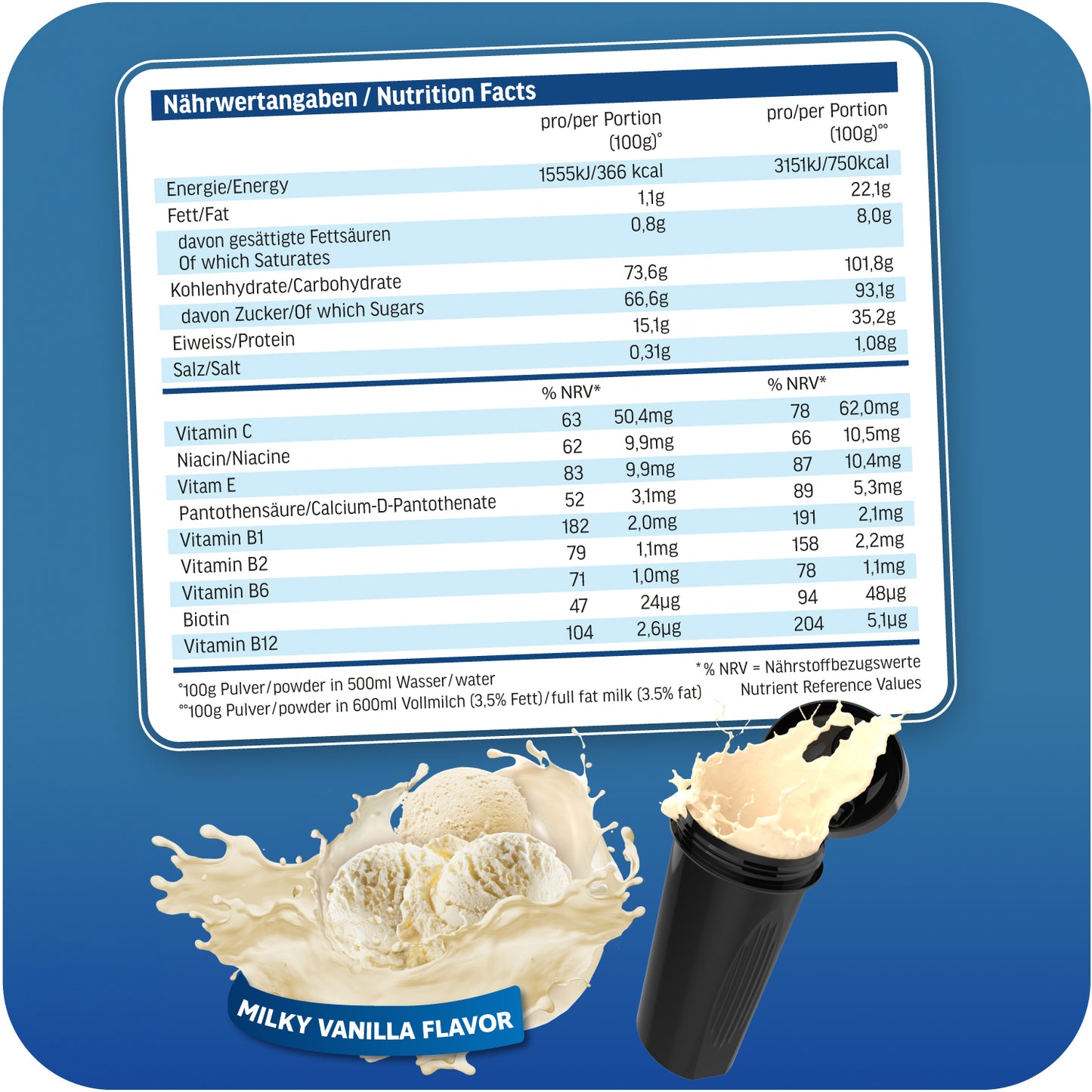 100 g prášku (2 odměrky = 1 porce) smíchejte v šejkru s 500 ml vody nebo 600 ml mléka. Pijte 1 šejk denně (v případě potřeby více), nejlépe k snídani, jako svačinu, před nebo přímo po tréninku.