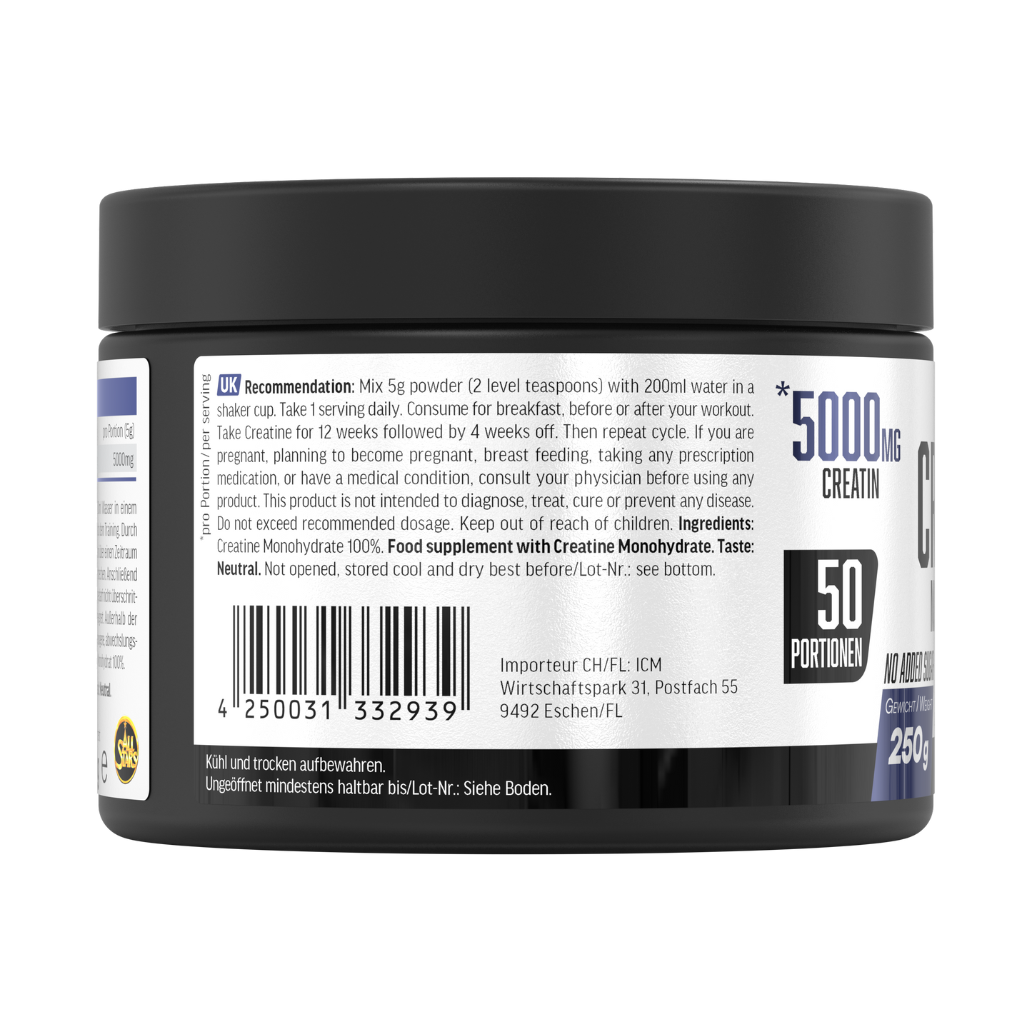 Neutrální prášek se skládá ze 100 % kreatin monohydrátu. Nebyly přidány žádné další plniva, konzervanty, sladidla, aromata ani barviva.