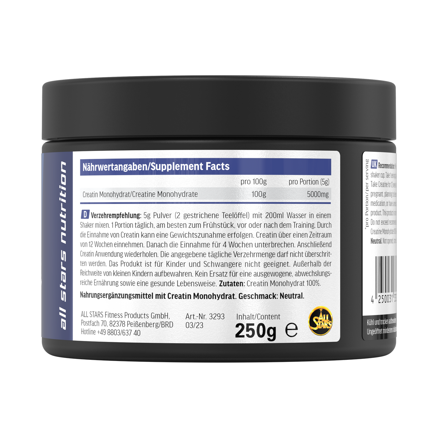Na 1 porci se smíchá 5 g prášku s 200 ml vody v šejkru a dobře protřepaná směs se vypije k snídani nebo před či po tréninku. ALL STARS doporučuje užívat jednou denně po dobu 8–12 týdnů. Poté by měla následovat čtyřtýdenní pauza v užívání kreatinu.